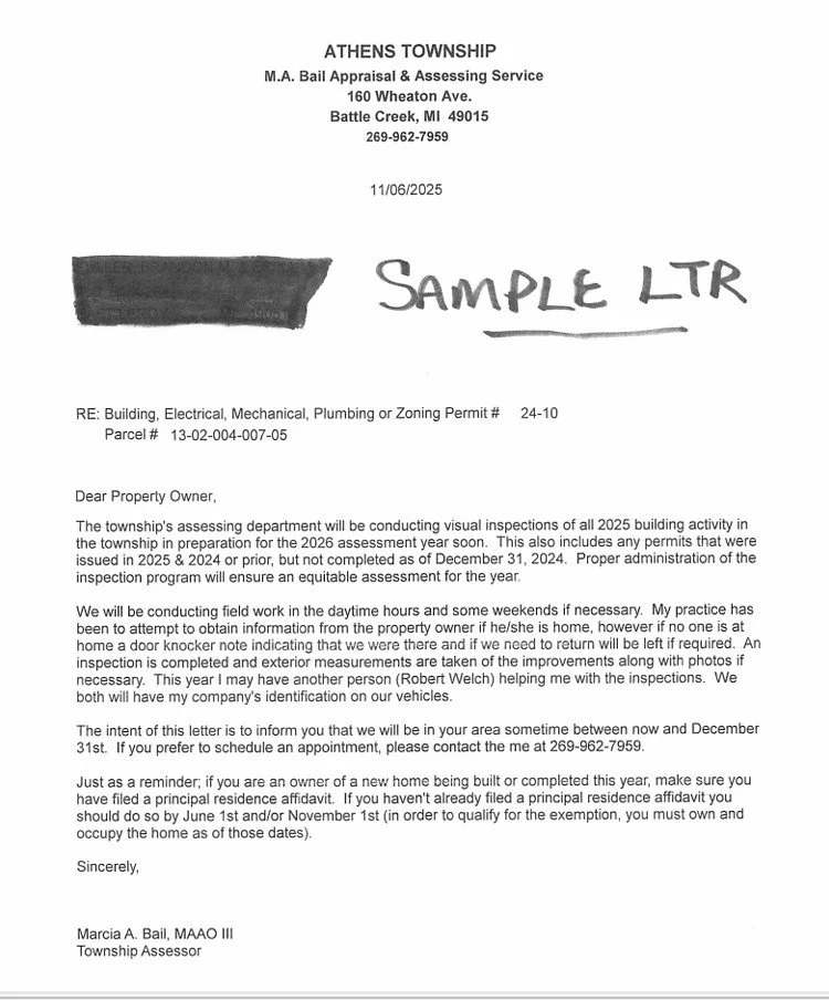 The township’s assessing department plans to visually inspect all 2025 building to prepare for the 2025 assessment year between now and December 31. Marcia Bail and Robert Welch are conducting the assessments and will arrive in a vehicle with the company’s identification.